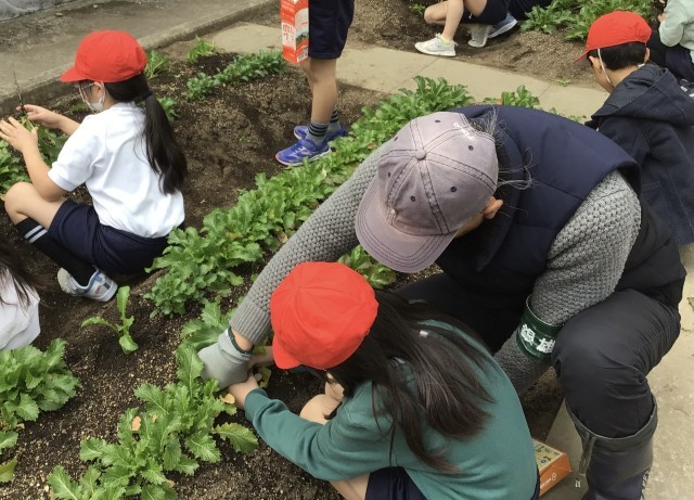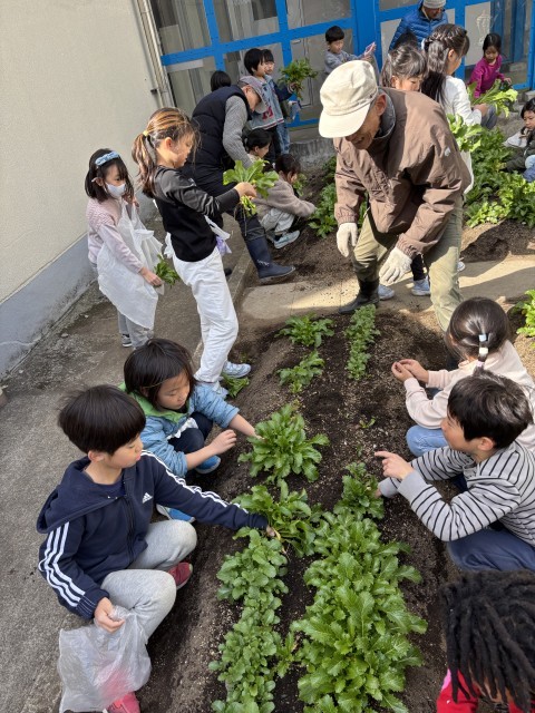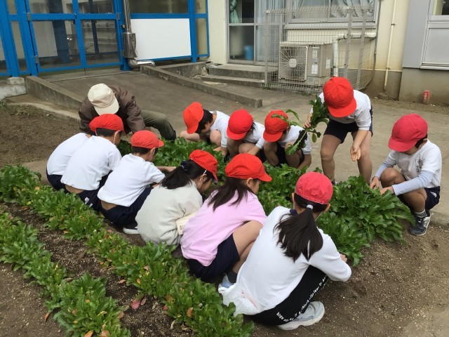 2年生 生活科「ぐんぐんそだて」の学習で、種から育てたからし菜の収穫を行いました。