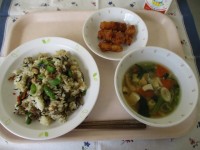 献立 キムチチャーハン 牛乳 ワンタンスープ フルー...