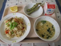 献立 三色ピラフ 牛乳 ベーコンと野菜のスープ煮 シ...