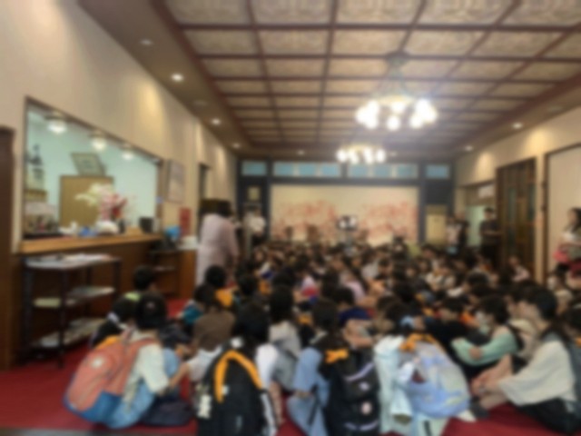 梅屋敷旅館に到着。ロビーで入館式を行いました。実行委員が司会をし、児童代表の言葉や連絡事項をしっかりと伝えました。女将さんからは温かい言葉で迎えられ、宿でもたくさんの思い出ができそうです。