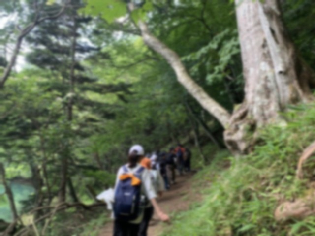 緑に囲まれた山道を左手に湯の湖を見ながら湯滝までハイキングをしました。東京ほどの暑さはありませんが、日差しは強くて日向は暑さを感じます。ハイキングコースは、木々に囲まれていて快適でした。湯滝の水量も多く、迫力ある美しさに見入る子どもたちでした。滝の始まりを見ながら滝の下まで歩いておりました。