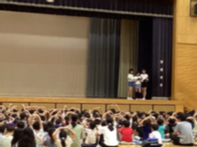 集会委員会の児童による児童集会を体育館で行いました。内容はイントロクイズ。「流れてくる音楽は、○○である。マルかバツか」。音楽を聴いて、正解を腕を使って表しました。集会の後は、看護当番の教員が、子どもたちの生活の様子ですてきなところや今週のめあてなどの話をしました。