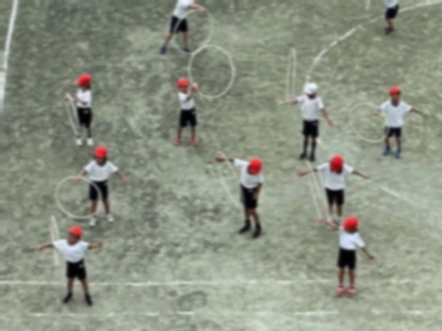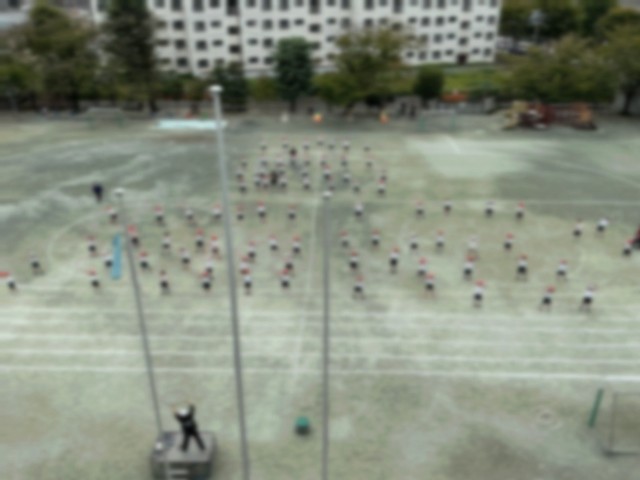 校庭での練習が始まりました.今年の2年生は、フラフープを使って表現運動をします。3クラスが、赤、白、青のフラフープを使って音楽に合わせて一生懸命に練習をしています。