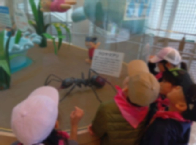 グループで昆虫館の見学をしています。昆虫のからだのつくりや動き、一生など興味津々の子どもたちです。展示されている昆虫からいろいろな気づきをしています。気が付いたことを友達と話しながらとても熱心に見学しています。