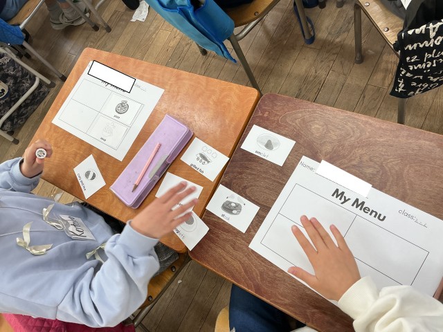 アクティビティでは、ペアになって簡単な英語でやり取りをしながら自分のオリジナルメニューを考えました。