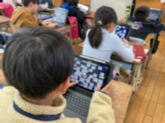 4年生の国語です。教材文を読んで、興味をもったことを中心に要約して紹介する文章を書いていきます。今日は、内容をまとまりごとに整理して、興味をもったことに沿って大事な言葉や文を書き出しました。タブレットの共有ノートを活用して友達の考えを見ながら整理していきました。共有ノートを使うと、子どもたちが1つの画面を共同編集することができます。