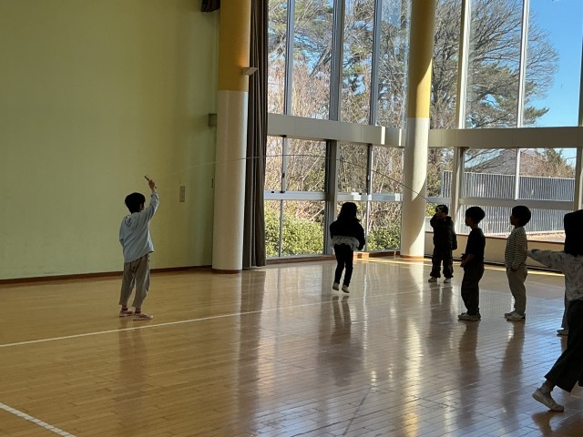 1年生の音楽では、童歌を聴いたり歌ったりしています。今日は音楽室を離れて、多目的教室での音楽です。「大波 小波」の歌に合わせて長縄跳びをして楽しみました。