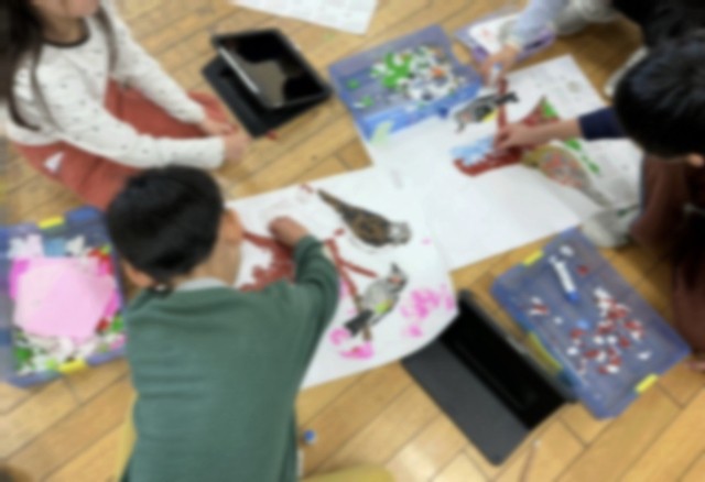 船橋小学校は、東京都指定愛鳥モデル校です。校舎の裏には、素敵な野鳥の森があります。四季の観察など、学習にも活用されいます。5、6年生児童による野鳥委員会では、定期的な探鳥会を3年生以上に呼びかけ、朝の時間に双眼鏡を使って野鳥の観察をしてます。写真は2年生が愛鳥カレンダーを作成しているところです。グループで背景や配置、色使いなどを話し合いながら、ちぎり絵でつくっていきます。