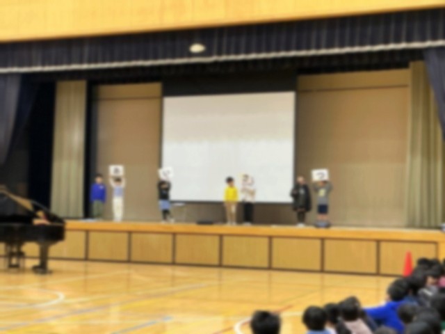 6年生から始まった挨拶運動もいよいよ1年生が担当します。児童集会の後には、1年生から「あいさつ」の一文字ずつから「こんな挨拶をめざします」を考えた挨拶宣言がされました。