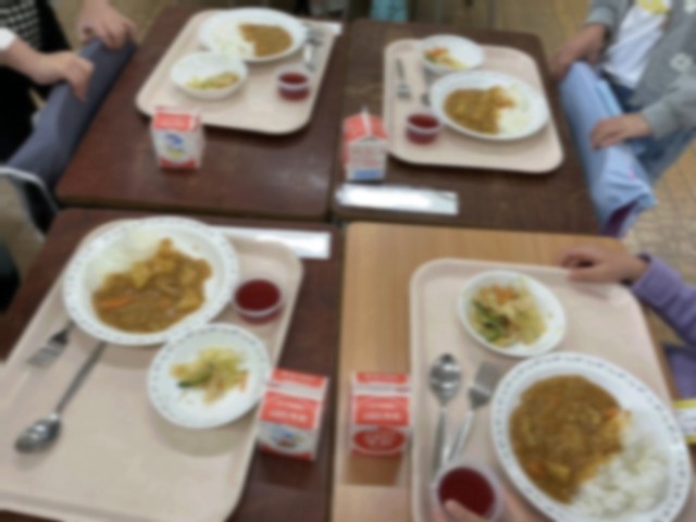 今日から1年生の給食が始まりました。準備や配膳がとても上手で驚きました。教員の他に、地域の方がボランティアでお手伝いしてくださっています。笑顔いっぱいでカレーライスを美味しく食べた1年生です。