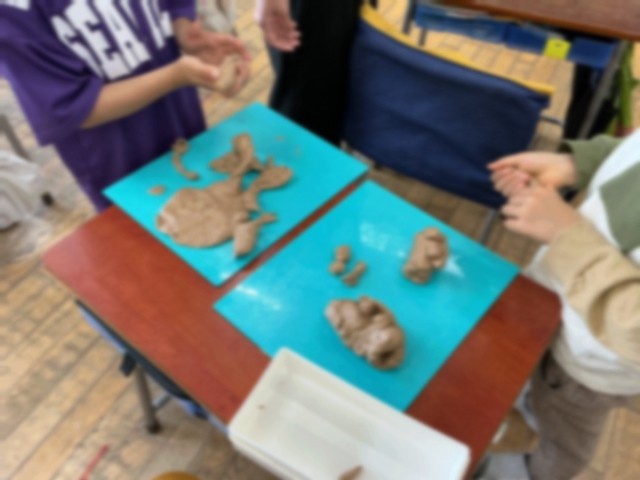 2年生の図工です。粘土の形をいろいろ考えて変えたりしながら、想像した生き物をつくりました。自分がつくりたい生き物のイメージを持って楽しみながらつくる子どもたちでした。