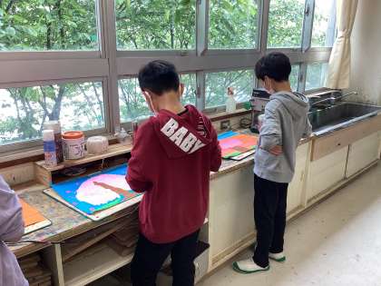 『心の花をさかせよう』の学習で、筆だけでなく、歯ブラシやスポンジなども使って想像を膨らませながらカラフルな絵を描いています。
