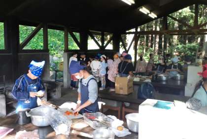 補助員の先生から説明を聞き、飯ごう炊さんを行いました。薪をくべたかまどてご飯を飯ごうで炊き、鍋でカレーをつくりました。みんなで協力してつくったカレーは、最高でした!