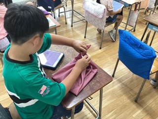 最初はおどおど、できない〜と諦めかけていた子どもたちも、しばらくすると、いろいろな包みかたを調べて上手に包んで満足げに見せ合っていました。