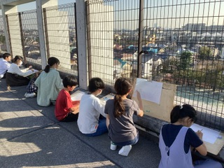 屋上に行き、船橋の街を眺め、自分の気に入った場所の絵を描いています。