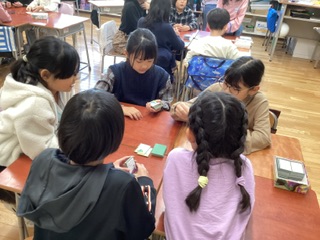 リズムよく読み進めたあとは、実際に「百人一首」の札を手にする子どもたち。