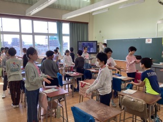 教科書に書いてある単語を、自分の持っているカードの中から選び、並べる活動です。