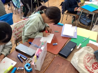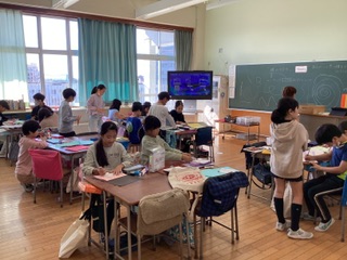 初めて教室で図工をすることで、子どもたちはわくわくしていました。