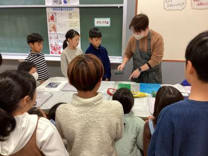 彫刻刀で彫った板を好きな色で刷る作業をしました。