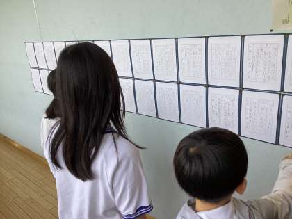 また、「6年生になったら、『平和な春』を書くんだ。」「これまでの書写の学習が詰め込まれていて難しそうだけど頑張ろう!」などと、来年への見通しや意欲をもちました。