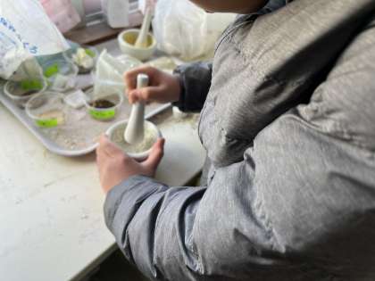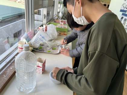 1組の総合の取り組みである「再生チョーク作り」を休み時間に行っていました。