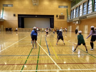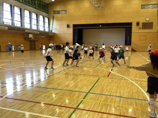 残っている雪で校庭を使うことができないため、体育館で、2クラス合同ドッジビー大会を行いました。