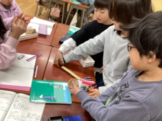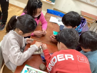 「ものの重さを調べよう」では、先日、身の回りのもので作った100gと同じ重さの粘土玉を予想して作りました。両手を使って重さを比べたり、算数で学習した天秤を作ってみたり、班によって様々な方法で予想しています。