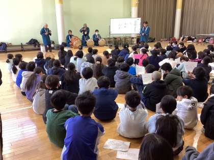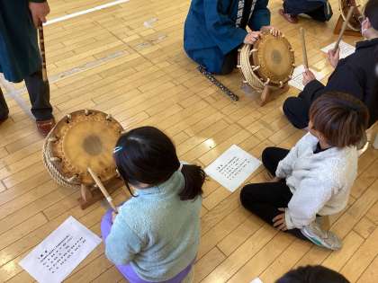 社会科の学習との関連、地域の方との交流ということでお囃子体験を行いました。
