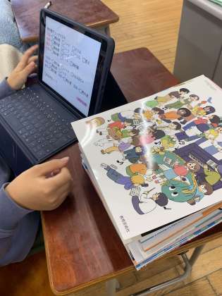 6年生の教室では、新しい教科書やドリル、ノートが配られていました。その数21冊。全部あるか、個々がチェックをしながら、新しい学習に意欲を見せていました。