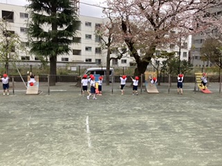 1年生全員で校庭に出て体育を行いました。