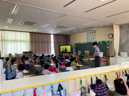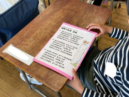 月曜日朝の時間に「1年生を迎える会」がテレビ放送で行われました。昨年度代表委員会が計画・運営を行い、各教室から1年生を温かくして迎えました。6年生は、校歌の歌詞カードにメッセージを書いてプレゼントしました。