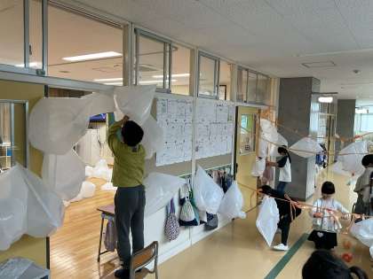3年生の図工で造形遊びをしました。ビニール袋に空気を入れて、友達と協力しながら工夫して教室に置いていきました。教室を覗くと、「校長先生、入ってください!」と子どもたちからの誘いが。白いビニール袋は雲のようで、くぐったり、寝転んだりすると空の中にいるようでした。空気の積み木の心地よさを味わった子どもたちです。