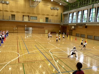 体育館で並び方の練習を行った後に、大股歩き、スキップ、カニ歩き(横歩き)、後ろ歩きに挑戦しました。