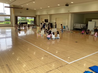 紙コップや割り箸、画用紙などを並べたり重ねたりして、できた形や色を楽しみました。