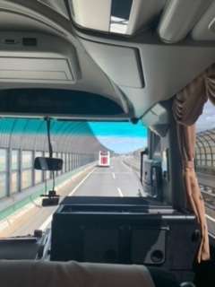 高速に乗りました。少し混雑しましたが、順調です。みんな元気です。一つ目のサービスエリアまであと15分程です。