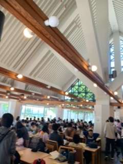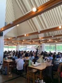 食堂でお弁当を食べました。食事係からの話や片付け方を聞き「いただきます」をしました。この後は外で集合写真を撮って部屋に入ります。