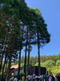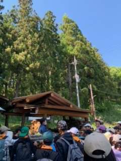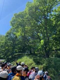 「里山入門」のプログラムに取り組みました。12組、34組に分かれて、ガイドさんに案内と説明をしていただきながらビレジ周辺の散策をしました。