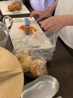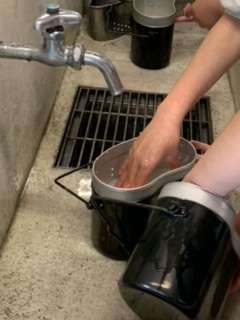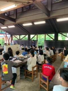 お楽しみの飯盒炊爨。説明を聞いてからスタートです。班で役割を分担して協力してカレーライスをつくります。