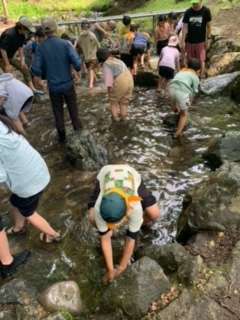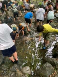 鱒つかみ体験をクラス毎にしました。うまくつかめたかな。岩の隙間をよく見て素早くつかまえようとしました。一人で何匹もつかまえる子どもが何人もいました。