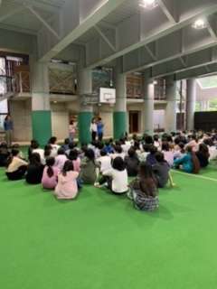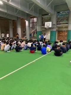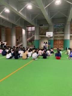 昨夜はよく眠れたようです。朝までぐっすり寝ていましたが、時間がくると素早い行動ができました。あいにくの小雨。朝会は屋根付き広場で行いました。