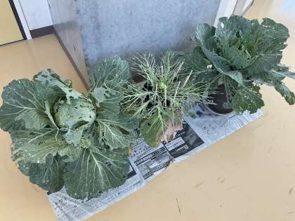 3年生から理科の学習が始まりました。モンシロチョウの卵が産みつけられたキャベツの鉢を廊下に置き、卵から幼虫までを観察しています。水曜日には、モンシロチョウになって廊下の窓に止まっているものも見られました。