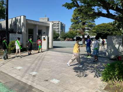 あいさつ実行委員が校門に立ち、元気なあいさつを促しています。