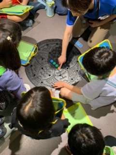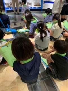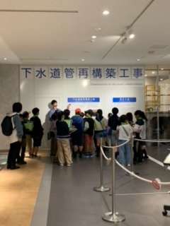 係の人の説明を興味深く聞いている4年生です。大切だと思ったところは熱心にメモをしています。