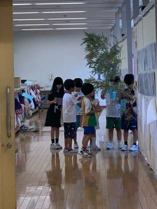 明日は七夕です。主事さんが学校にある笹を低学年の教室まで運んでくださいました。短冊やカードに願い事を書いたり、飾りを飾ったりしました。