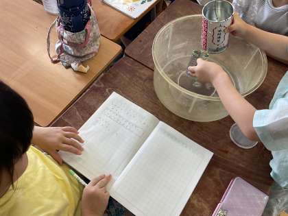 2年生の算数では、「水のかさの単位」の学習をしています。今日は、身の回りの容器のかさを予想しながら測定しました。かさの単位「デシリットル(dL)」を用いてノートにまとめて行きました。