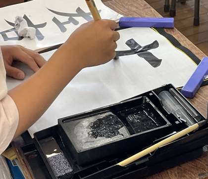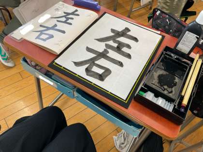 4年生の視写の時間に毛筆で「左右」を書きました。筆順と字形にはどのような関係があるのか考えて、書きました。お手本をよく見て、めあてを意識して練習をする子どもたちでした。