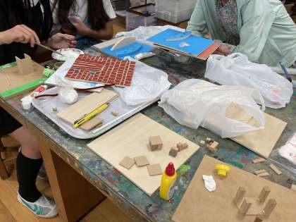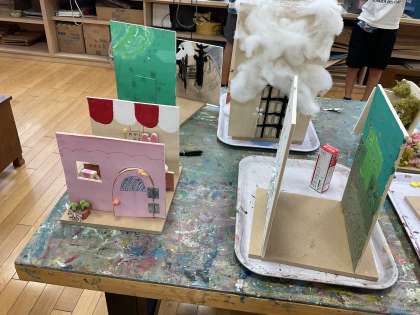 6年生の図工では、扉の向こうの世界を想像しながら、材料の組み合わせを考えてそれぞれがつくりました。子どもたちの創作意欲、創意工夫には驚かされます。図工室をのぞくと、それぞれの子どもたちが、自分たちの作品世界を説明してくれます。つくることを楽しんでいることが伝わってきます。