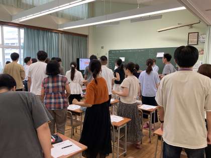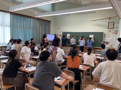 夏季休業に入りました。22日月曜日に教職員の外国語研修を行いました。講師2名から中学年を対象とした授業のあり方や内容についてアクティビティを通して学びました。今後の授業に活かしていきます。