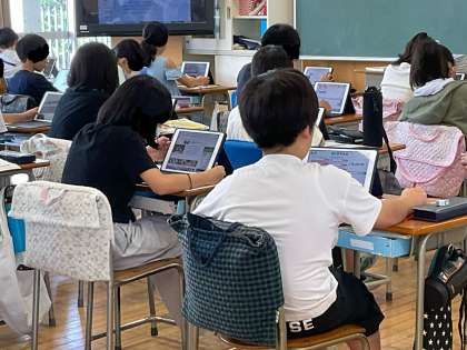6年生の国語です。インターネットで得られる情報には、テレビや新聞などから得られる情報とはどのような点が異なるか考えました。ニュースサイトの読み方を知り、活用の仕方を考えて今後の学習や生活に活かす力を付けていきます。