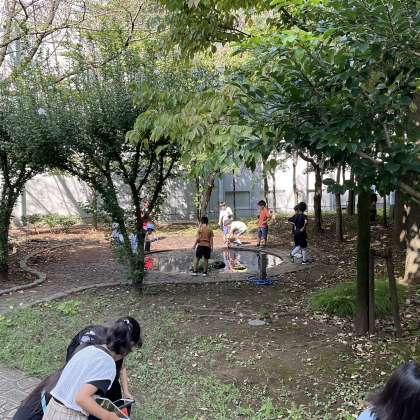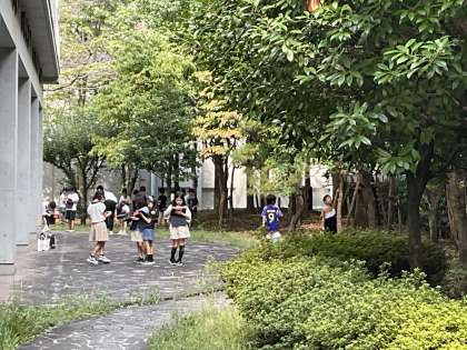 船橋小学校の校舎の裏には、「野鳥の森」があります。今日は、2年生が生活科の学習で、タブレットを手にして、「野鳥の森」で「小さな友達」である生き物探しをしました。「あんなところに、こんな生き物が」「蝉の抜け殻がたくさんある」「バッタがたくさんいる」などなど、見つけた生き物を写真に撮り、身近に見られる生き物に関心を深めました。